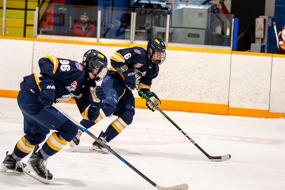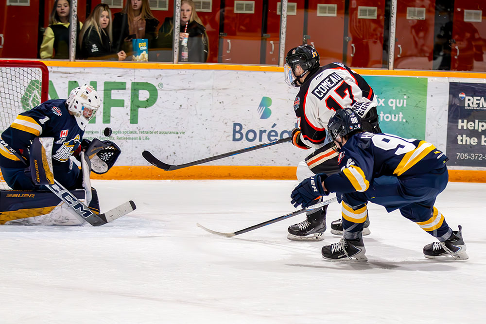 There, the NOJHL’s leading goal-scorer, Cameron Menard, made his mark in his Lumberjacks’ debut by slamming in the game-winner into a gaping net, finishing an impressive play with Comeau and William Pâquet to end it.