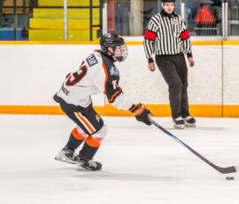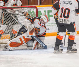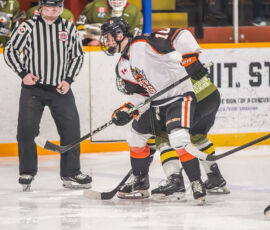 Striking from a sharp angle in the corner, Powassan’s Heath Bradley fired a low shot to the target that eluded Hearst starter William Stonehouse, early into the contest, to give the guests the lead.