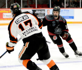 Hearst finally solved Timmins’ goalkeeper Frédéric Cousineau during a lengthy five-on-three midway through the third when Mathieu Comeau chipped in a rebound from William Pâquet shot that the netminder could not quite corral, which rounded out the scoring.